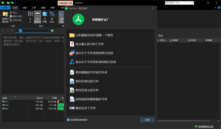 这是一款硬盘空间管理工具,它能够显示文件大小和实际占空间数及其浪费的空间等,让小伙伴们可以最清楚的了解电脑硬盘中的情况并对其进行处理。第一次进入软件会给小伙伴们一个向导提示,小伙伴们可以对上面的功能要求进行选择并操作。
